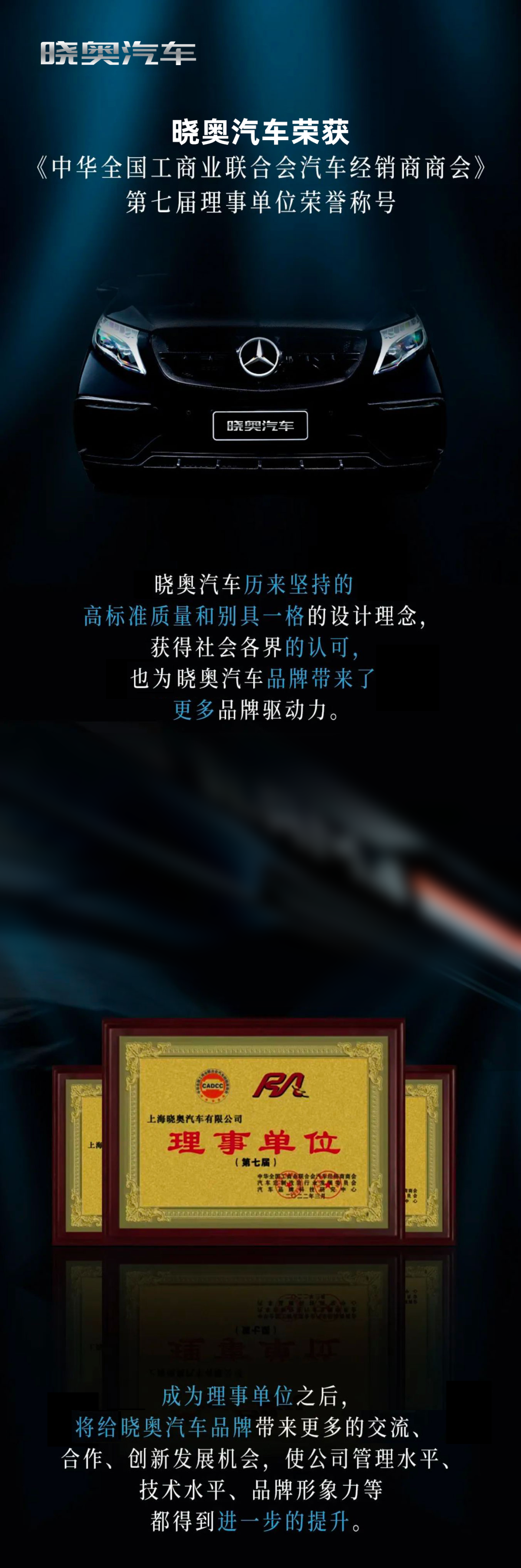 晓澳汽车荣获《中华全国工商业联合会汽车经销商商会》第七届理事单位荣誉称号