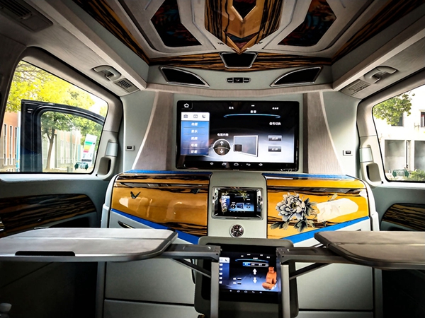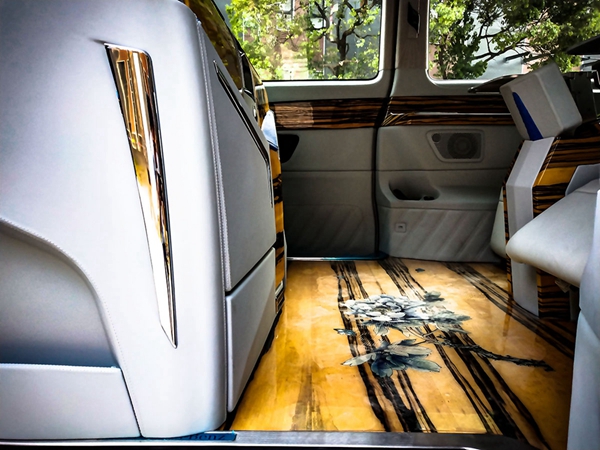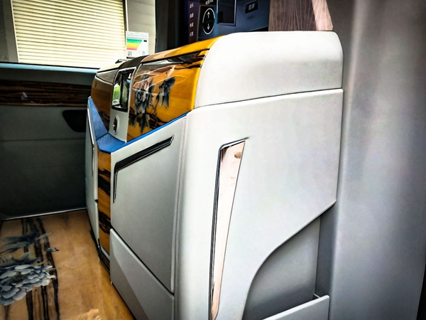 双侧电动滑门打开,电动伸缩踏步,进入车内,实木地板定制水墨画国风图案。内饰、座椅配色与驾驶室保持一致,真皮包覆蓝色鸵鸟皮镶嵌包边,座椅细密打孔,通风透气性强,持久舒适。隐藏式折叠桌板流畅拉出,满足商务办公或者用餐的需要。