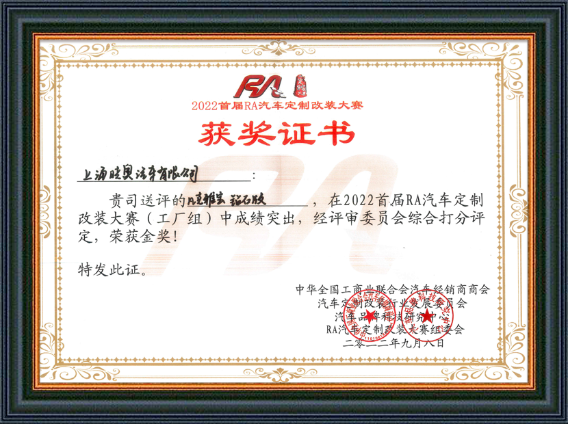 2022年9月9日,为期三天的第十八届RA(杭州)国际汽车定制改装博览会及首届RA定制改装大赛圆满落幕。晓澳汽车以“凡克雅宝车型”作为参赛车型,获得了评委专家组的全面肯定,荣获金奖。